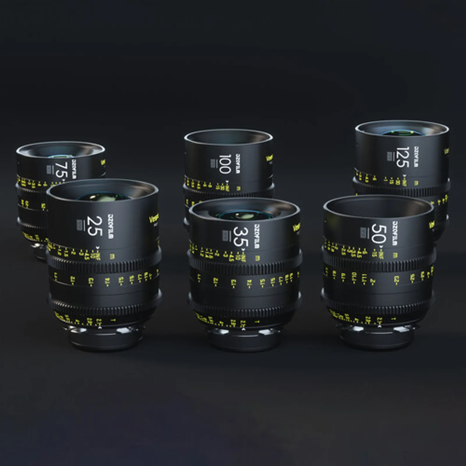 A comprehensive collection of VESPID prime lenses suitable for PL and EF mount systems, featuring focal lengths ranging from 25mm to 125mm. This set is ideal for cinematic applications and comes securely packaged in a hard case.